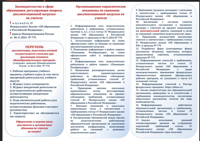 С 1 марта 2025 года вступает в силу Приказ Министерства просвещения Российской Федерации от 06.11.2024 № 779 "Об утверждении перечня документов, подготовка которых осуществляется педагогическими работниками при реализации основных общеобразовательных программ, образовательных программ среднего профессионального образования" (Зарегистрирован 04.12.2024 № 80454), регулирующий объем документарной нагрузки педагогических работников http://publication.pravo.gov.ru/document/0001202412050007